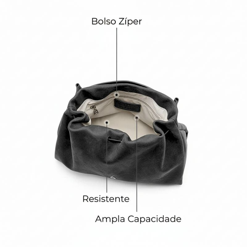 Confeccionada em couro natural de acabamento premium, possui textura suave e resistência duradoura, com fechamento por ajuste e alça reforçada que garante conforto e sofisticação.