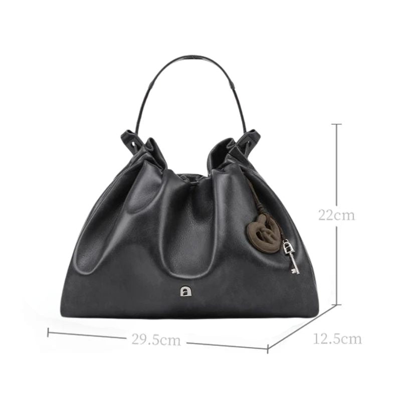 As pregas inspiradas no clássico brioche francês criam um efeito escultural que transforma a peça em uma obra de arte portátil, macia ao toque, firme no estilo.