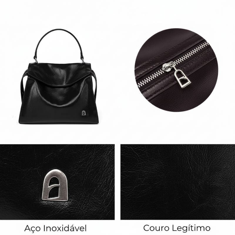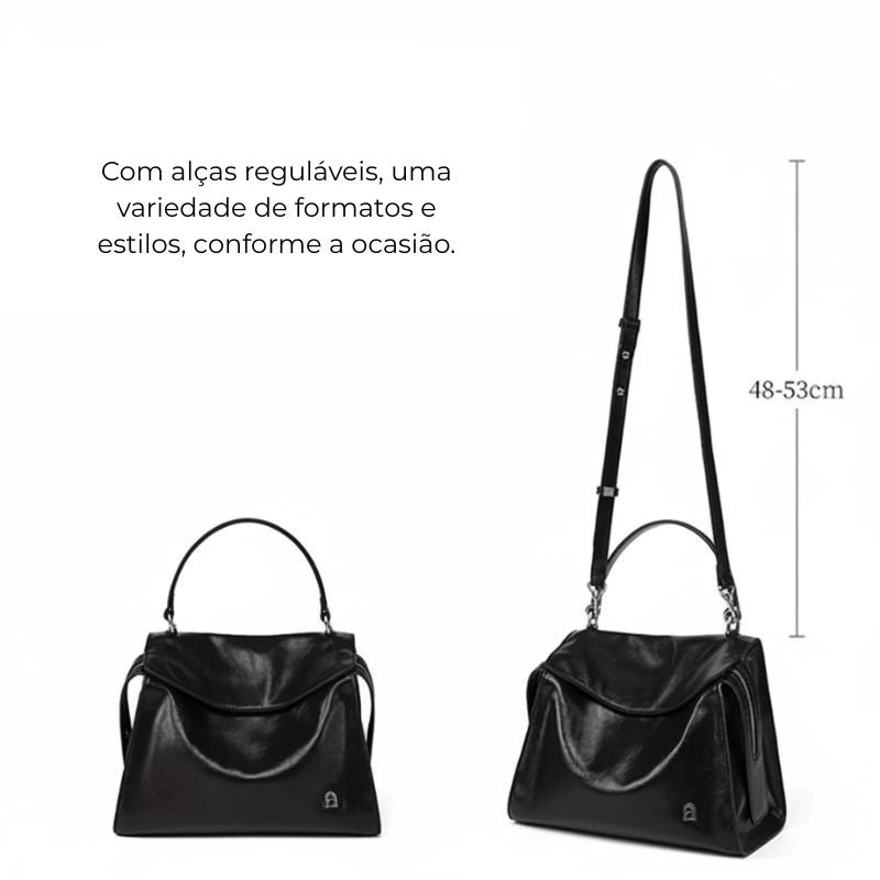 Acompanha alça longa ajustável e removível, permitindo usar tanto como bolsa transversal quanto no antebraço. Compacta por fora, surpreendentemente funcional por dentro.